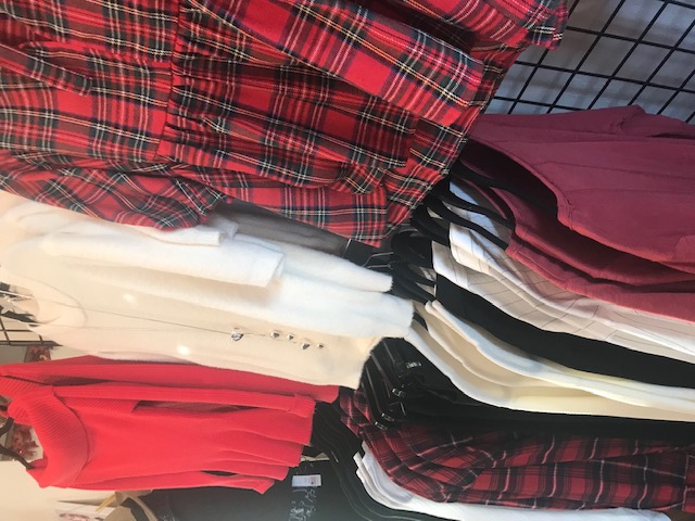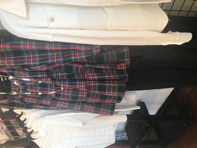 We have wonderful off white sweaters, black plaid holiday tops , and off winter white jackets