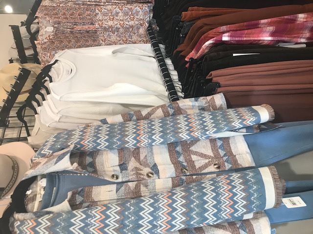 Fall peasant blouses, Southwestern jackets, and white thermal for layering.