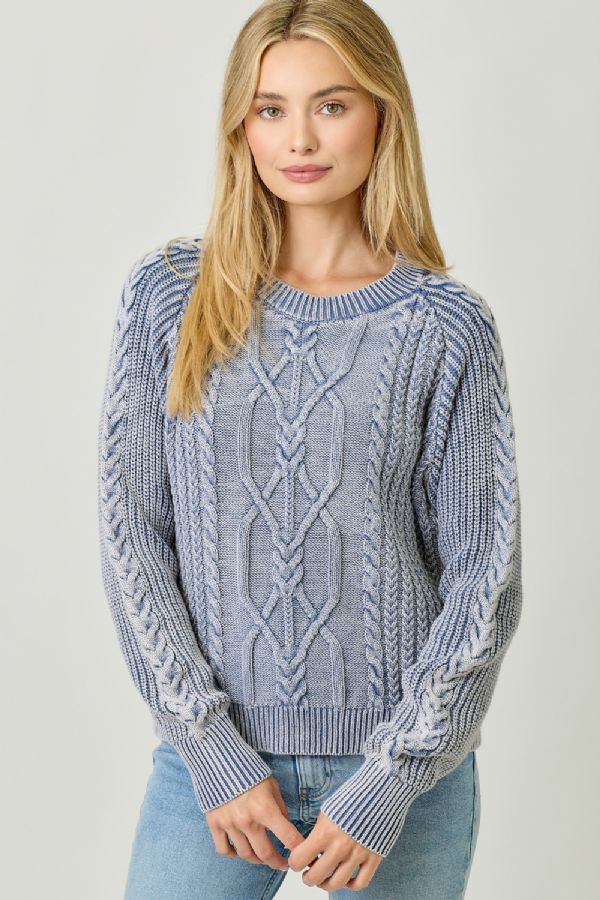 It's sweater weather. We love the Mystree cable sweater. available in black, almond, sage green and denim blue. $58.00